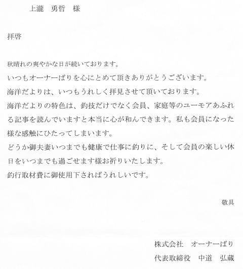 営業マンとの交遊は行橋に引越してからも続き、機関誌「海洋だより」を送付すると、必ずお礼の手紙、電話、そして釣り大会にはいつもオーナーばり寄贈の鈎額があった。